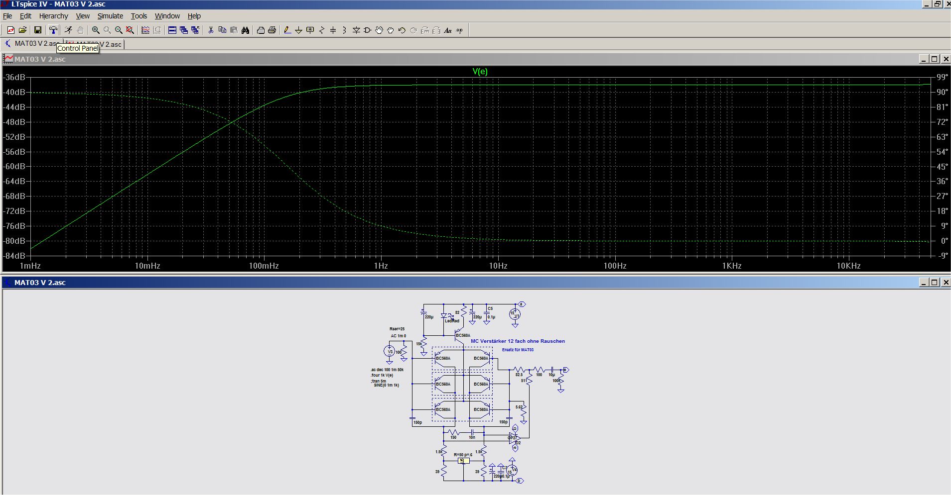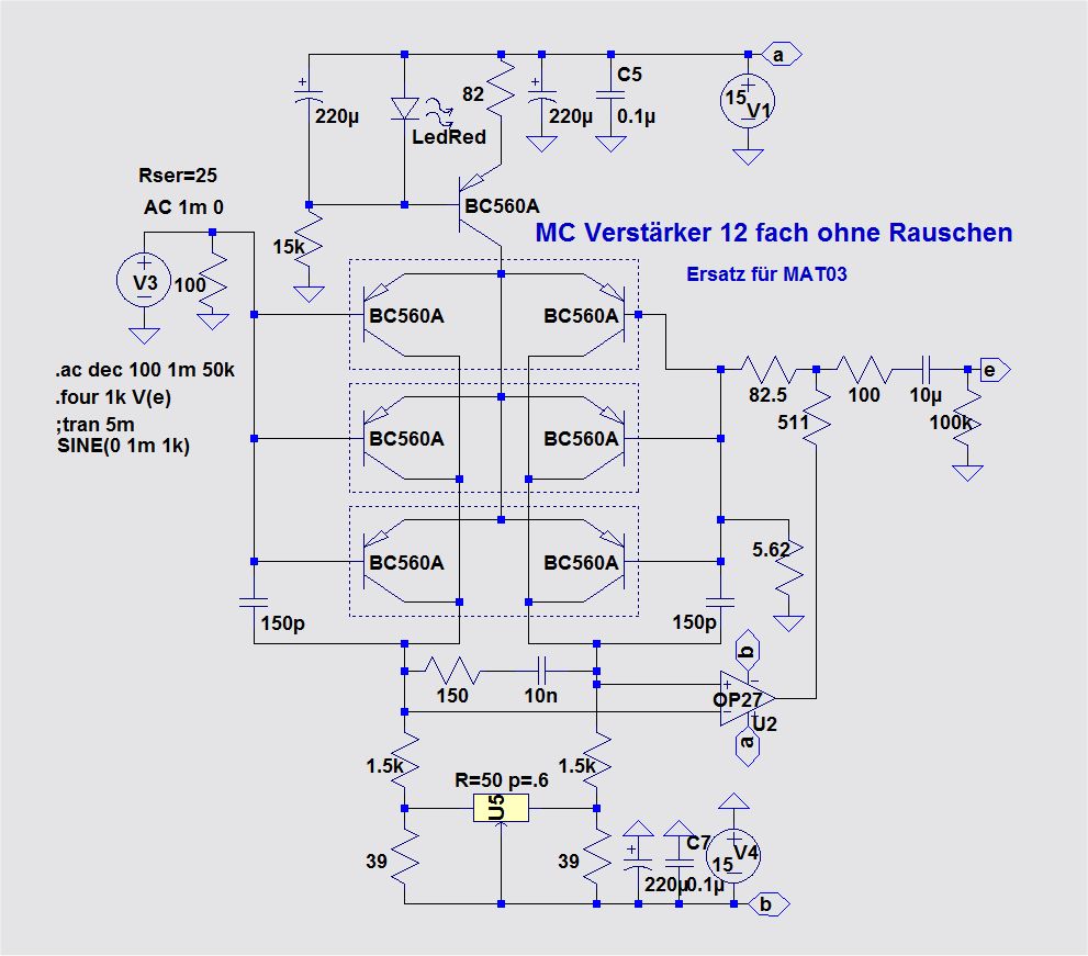 Der MAT03 wurde abgekündigt. Schade, da es sehr gute Schaltungen mit ihm gab. Hier ein Beispiel eines MC Vorverstärkers. Mit LTspice konnte ich die besten Transistoren dafür ermitteln. So funktioniert die Schaltung sehr gut an Verstärkung und einem sehr guten Frequenzgang.